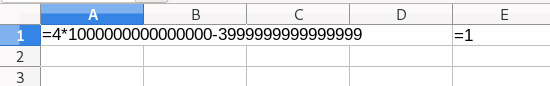 meinem 10-stelligen Taschenrechner 4 000 000 000 000 -3 999 999 999 995 ein so erhalte ich das Ergebnis 1, da nach den 10 Stellen bei der Eingabe alles abgeschnitten wird. Der Eingabe-Speicherplatz reicht nur für 10-stellige Zahlen. Auch wenn sich die Eingabe-Zahlen richtig in den Taschenrechner eintippen lassen kann durch den begrenzten Speicherplatz beim Berechnen Fehler entstehen. Dazu als Beispiel die folgende mathematische Gleichheit |