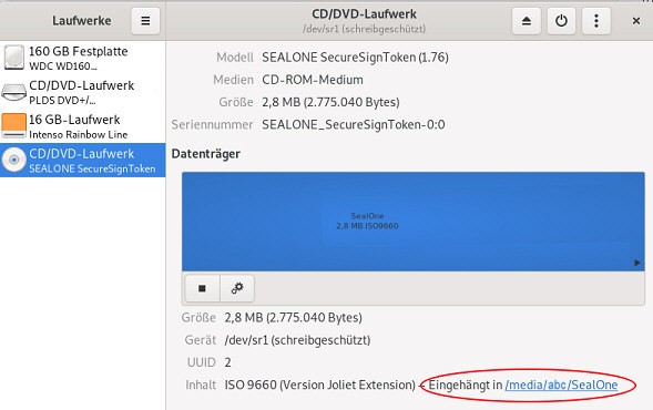 Man sieht daß seal-one als CD/DVD-Laufwerk erkannt wurde und Nicht eingehängt wurde. Es gibt ein kleines Dreieck auf das man klicken kann um Ausgewählte Partition einhängen auszuwählen. Nach Klicken auf das Dreieck |