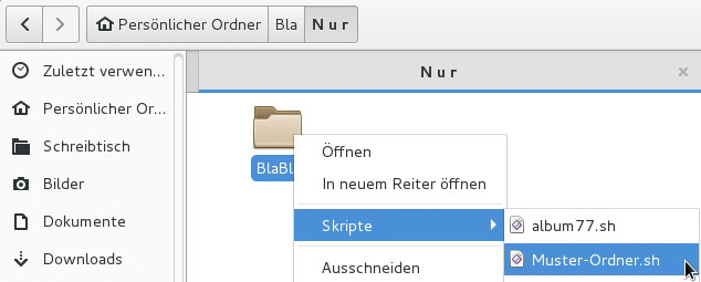 Ordners und Rechts-Klicken auf das script Muster-Ordner.sh erzeugt man die Ordner-Struktur in dem markierten Ordner. Durch Markieren einer Datei und Rechts-Klicken auf das script Muster-Ordner.sh erzeugt man die Ordner-Struktur in dem Ordner in dem diese Datei liegt. |