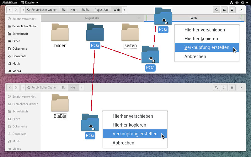 | Bei Debian 12: Man drückt gleichzeitig Str + linke Umschalt-Taste und zieht eine Datei/Ordner mit der linken Maustaste (während des Ziehens Str + linke Umschalt-Taste gedrückt halten). Nach dem Erreichen des gewünschten Ortes läßt man zuerst die Maustaste los, dann auch die anderen Tasten loslassen. Dies funktioniert beim Ziehen über den Reiterkopf eines Ordners oder bei dem Ziehen in einen geöffneten Ordner in einem eigenen Fenster. Das Klicken mit der rechten Maustaste bietet auch die Möglichkeit für das Erstellen einer Verknüpfung. Z.B. durch ein kleines script. |