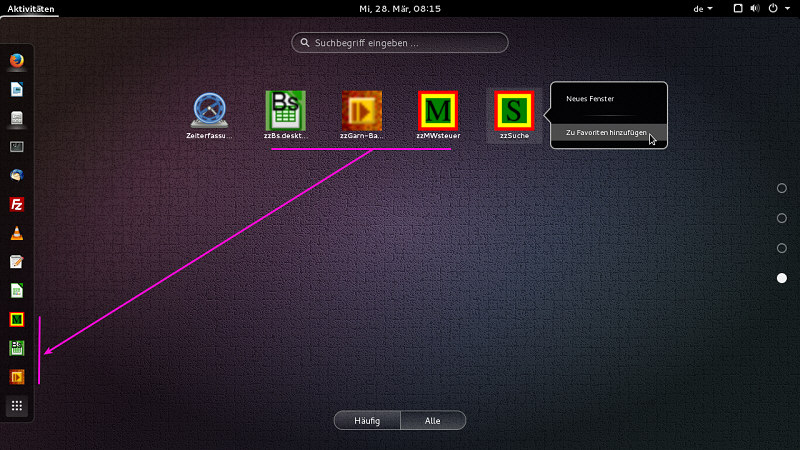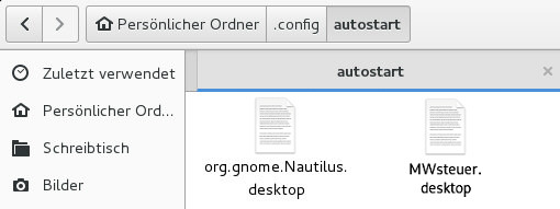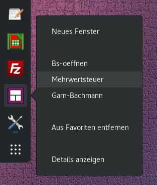 das gewünschte Objekt einen Rechtsklick und wählt An Dash anheften (Bei Debian 11: Zu den Favoriten hinzufügen). Kopiert man den .desktop-Starter MWsteuer in den Ordner ~/.config/autostart |