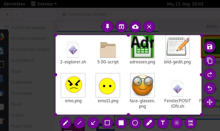 | Damit kann man schon arbeiten und evtl. eine Tastenkombination für das script einrichten. Aber es soll das zenity-Fenster über das System aufgerufen werden, so wie das bei installierten Programmen der Fall ist. Dann kann man den Aufruf des zenity-Fensters auch über den Dash-Starter veranlassen. Dazu braucht man zuerst ein Icon, das man über flameshot selbst herauskopieren kann: |