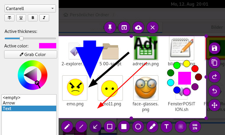 | Fährt man mit der Maus auf einen Bearbeitungsknopf so wird ein kleines tooltip zur Erläuterung ausgegeben. Das Mausrad verändert die Dicke von Strichen oder von der Schriftgröße. Das Drücken mit der rechten Maustaste läßt einen Farbauswahl-Kreis erscheinen. Durch Drücken der Leertaste kann man ein ausführliches Bearbeitungsmenu aufrufen und wieder verschwinden lassen |