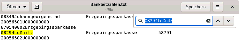 vorherigen Seiten über Programmfenster werden hier weitergeführt. Bankleitzahlen.txt in dem Ordner ~/Bla Es soll nun gezeigt werden wie man über das Terminal (das man im Ordner ~/Bla öffnet) diese schon etwas umfangreiche txt-Datei bearbeiten kann um von einer vorgegebenen Bankleitzahl zu der entsprechenden BIC zu gelangen. Sicherlich kann man diese Datei mit einem Textprogramm öffnen und die Suchfunktion nutzen aber hier sollen Gedanken zum Terminal beschrieben werden. Dabei werden Terminal-Befehle wie Bausteine benutzt, überwiegend solche für sed. Eine schöne Liste dazu ist zu finden unter http://sed.sourceforge.net/sed1line_de.html Zunächst muß man die Bearbeitung der Datei durch das Terminal ermöglichen. Öffnet man diese Datei mit gedit und sucht nach08294Lößnitz so erhält man das Ergebnis. |