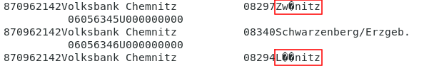 870962142Volksbank Chemnitz 08294Lößnitz Volksbank Chemnitz 98040 06056347U000000000 Es soll nach der BLZ gefiltert werden und die zugehörige BIC bestimmt werden, z.B. |