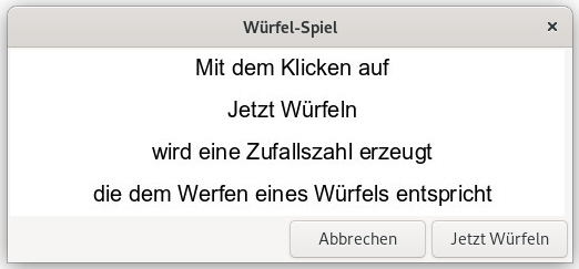 1066 1 956 2 986 3 1032 4 967 5 993 6 Die ausgegebenen Werte sind ein Beispiel, da die Zahlen zufällig erzeugt werden ändert sich die Ausgabe bei jeder while-Schleife. ((i++)) bedeutet daß der Wert der in $i gespeichert ist um 1 erhöht wird. Es wird ein script aufgeschrieben das dem Würfeln analog ist. Beim Aufrufen des scriptes öffnet sich ein yad-Fenster zur Information. |