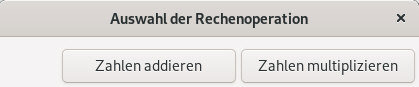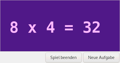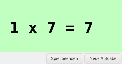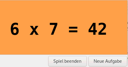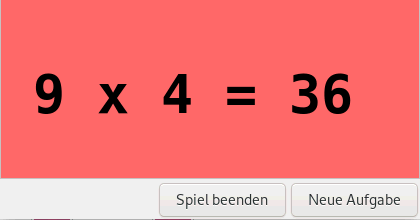 | Nun kann man entscheiden ob man eine zufällige neue Aufgabe haben will oder das Spiel beenden will. Das Aufgabenfenster hat keine Schaltflächen aber es verschwindet nach wenigen Sekunden und wird durch das Lösungsfenster ersetzt. Wenn man es trotzdem vorher verschwinden lassen will kann man die ESC-Taste drücken. Die Farben der yad-Fenster wechseln zufällig in 6 verschiedenen Farben |