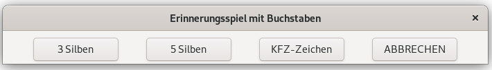 vorherigen Seiten über Programmfenster werden hier weitergeführt. Bei diesem Spiel geht es wieder um ein Gedächtnistraining. Auf dem Bildschirm werden Buchstaben-Zeichen-Kombinationen angezeigt. Möglich sind 3 Silben oder 5 Silben. Oder ein KFZ-Kennzeichen wobei nur die Zeichenfolge eines KFZ-Kennzeichens angezeigt wird und nicht notwendig ein wirklich existierendes Stadtkürzel. |