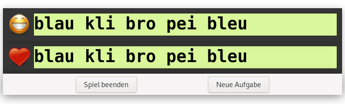 | Nun kann man entscheiden ob man eine zufällige neue Aufgabe des gleichen Typs haben will oder das Spiel beenden will. Die smily wechseln zufällig in 9 verschiedenen Ausführungen. Diese liegen im Systembereich von Debian, z.B. |