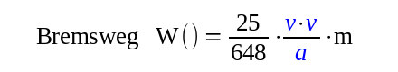 Auf dieser Seite gilt die Dimension bei Bremsverzögerung a ist Meter pro Sekundenquadrat a bedeuted die positive Zahl bei Bremsverzögerung (z.B. 5) Es gilt nach Straßenverkehrs-Zulassungs-Ordnung (StVZO) § 41 : Kraftfahrzeuge müssen mindestens eine Bremsverzögerung von 5,0 m/s² erreichen. Bei nasser Straße kann man diese Bremsverzögerung von ca. 5m/s² annehmen (a=5). Bei trockener Straße kann man eine Bremsverzögerung von 7m/s² annehmen (a=7). Andere Straßenverhältnisse - Schnee, Eis, starker Regen, rutschige Fahrbahn durch Verschmutzung - führen teilweise zu deutlich niedrigeren Werten. Daher wird bei dieser Rechnung die Situation in der Realität nur näherungsweise erfaßt, aber besser erfaßt als durch die Faustformel in der Fahrschule (die jedoch leichter im Kopf zu berechnen ist). Beim Aufruf des script wird ein Info ausgegeben: |