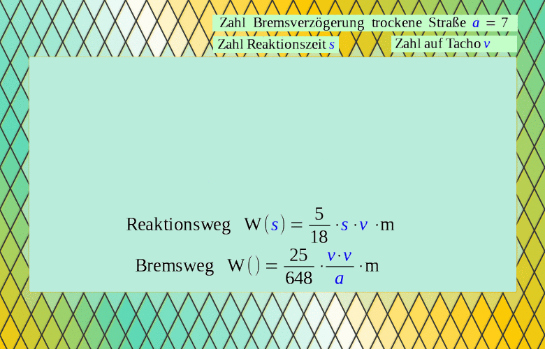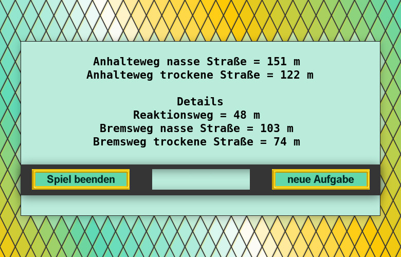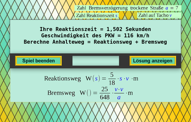 Bei einer Geschwindigkeit von 36 km/h also v=36 (Tacho-Anzeige) fährt das Auto in 1/2 Sekunde (ein kurzer Blick zur Seite) 5 m weit. Bei einer Geschwindigkeit von 126 km/h also v=126 (Tacho-Anzeige) fährt das Auto in 1 Sekunde (Schrecksekunde) 35 m weit. Bei dem folgenden Lernspiel soll der Anhalteweg eines PKW bestimmt werden. Dazu wird die Reaktionszeit gemessen und bei vorgegebener Geschwindigkeit zunächst der zurückgelegte ungebremste Weg bestimmt (Reaktionsweg) und anschließend der Bremsweg bei voll durchgetretener Bremse (Gefahrenbremsung). Dieser Bremsweg berechnet sich durch |