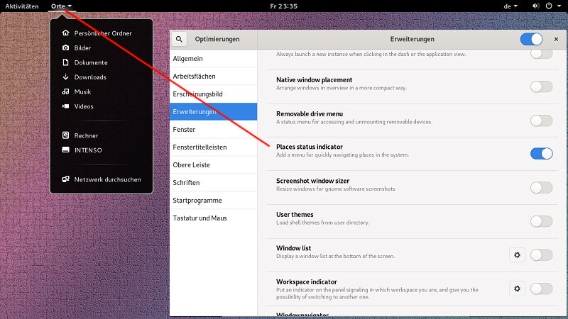 drückt man die Eingabetaste. Ist das CD-Fach bereits geöffnet so bewirkt die gleiche Eingabe das Schließen des CD-Faches. Diese Eingabe wird allerdings nicht in allen Fällen unterstützt. Man kann den gnome-Bildschirm durch viele Möglichkeiten verändern. |