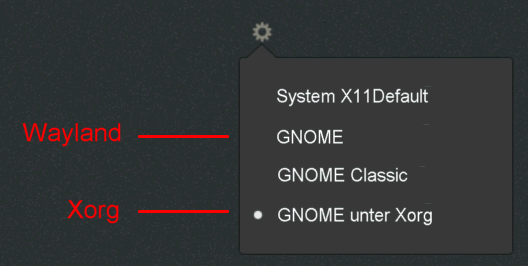 | Dann erscheint ein kleines Zahnrad auf dem Bildschirm unten rechts. Das Klicken darauf ermöglicht eine Auswahl die für mich als Anfänger schwer zu verstehen war. Vielleicht verhält es sich so: Linux benutzt Xorg um Fenster auf dem Bildschirm erscheinen zu lassen. Xorg ist schon sehr alt (und bewährt) aber es soll eine neue Fenster-Gestaltung durch Wayland geschaffen werden. Möglicherweise möchte man das Terminal völlig in den Hintergrund treten lassen und Software nur noch über bunte Bildchen installieren. Man hat aber immer noch die Wahl zwischen diesen beiden Systemen. Und das Terminal ist keine Horror-Figur sondern ein unglaublich wertvolles Hilfsmittel - es muß nur jemand verständlich darüber schreiben. Ich habe mich entschieden GNOME unter Xorg zu starten. |