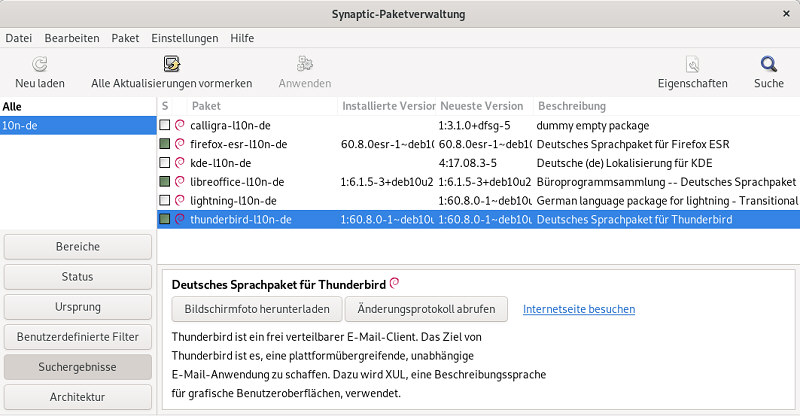 erhält man eine Themen-Übersicht. Sehr vorteilhaft ist die Suche nach Software. Wichtig war mir zunächst die Installation deutscher Sprachpakete. Diese kann man durch Eingabe von 10n-de in das Suchfeld schnell sichtbar machen: |