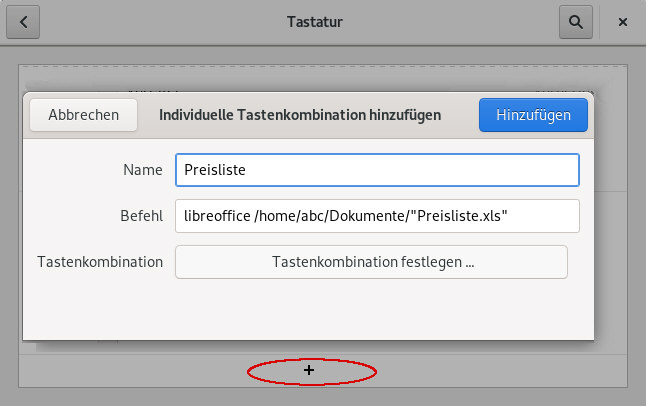 Eintrag durchsucht. Man kann die Internetseite https://extensions.gnome.org aufrufen mit hunderten von Einstellungen. Die Vielzahl der Möglichkeiten ist überwältigend. Diese Änderungen können in der Regel ganz leicht wieder rückgängig gemacht werden. Ich persönlich finde die Erweiterung Dash to dock besonders schön. Meist legt man auf dem Windows-Desktop Dateien ab, die man oft braucht und schnell öffnen möchte. Dies kann man natürlich in einem selbst erstellten Ordner machen. Mein Wunsch nach einer Schaltfläche im Panel mit der ich oft benutzte Dateien direkt aufrufen kann erfüllte sich jedoch nicht. Die Verwendung von Tastenkombinationen ist eine elegante Lösung und auf den späteren Seiten finden sich viele weitere Ideen. Die Tastenkombination ist weitgehend frei wählbar, aber es ist nicht verkehrt wenn man die gewünschte Tastenkombination erst einmal ausprobiert. Drückt man z.B. Alt+P (gleichzeitig die Taste Alt und die Taste P) und es erfolgt keine Reaktion so ist diese Tastenkombination noch nicht belegt und man kann diese unbesorgt verwenden. Nun soll Alt+P eine Preisliste öffnen, die zu finden ist unter /home/abc/Dokumente/"Preisliste.xls" (abc ist natürlich durch Ihren username zu ersetzen). Zunächst probiert man den Befehl im Terminal |