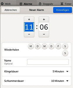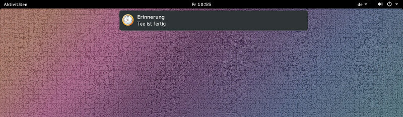 | Erläuterung dazu sleep 4s && notify-send -t 5000 -i ~/Bilder/icons/uhr.png "Erinnerung" "Tee ist fertig" Der Start des nachfolgenden Programmes wird um 4 Sekunden verzögert. Diese Zeit wurde gewählt um schnell zu sehen was passiert. Nützlicher ist die Angabe in Minuten - z.B. 10m ergibt eine Verzögerung von 10 Minuten. Man könnte auch Stunden oder Tage eingeben, aber das ist hier vielleicht nicht so sinnvoll, da die Funktionsfähigkeit davon abhängt daß das Terminal nicht geschlossen wird. Bei einem Schließen des Terminals wird der Prozess abgebrochen - siehe jedoch die Anmerkung unten. Aber man kann mehrere Terminalfenster gleichzeitig öffnen (z.B. Mausrad-Klicken auf das Programmsymbol