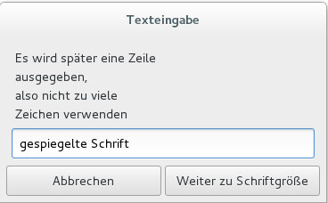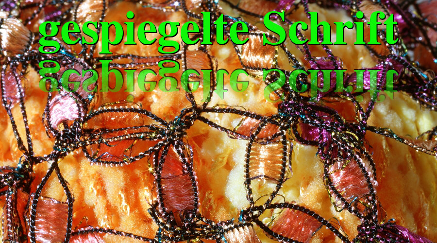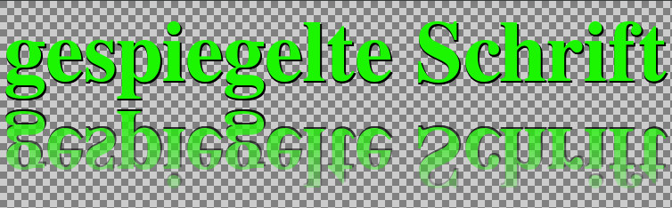 | Diese grafische Fenster-Darstellung ist sehr schön aber das convert-Kommando in das Terminal einzugeben erlaubt sehr viel mehr Möglichkeiten. So ist die Schriftart hier fest vorgegeben - man kann natürlich ein Auswahlfenster für Schriftarten hinzufügen. So ist die Stärke des Transparenzverlaufes hier fest vorgegeben mit 98% - man kann natürlich ein Auswahlfenster für die Stärke des Transparenzverlaufes hinzufügen. Die Spiegelung ist hier für ein gezeichnetes Textbild durchgeführt worden, aber diese Spiegelung funktioniert auch bei jedem anderen Bild. |