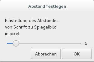 | szAb=$(zenity --scale --title="Abstand festlegen" --text=" Einstellung des Abstandes \n von Schrift zu Spiegelbild \n in pixel" --min-value=0 --max-value=50 --value=10 ); echo $szAb |