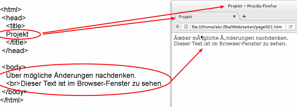 <html> <head> <title> Projekt </title> </head> <body> Über mögliche Änderungen nachdenken. <br>Dieser Text ist im Browser-Fenster zu sehen. </body> </html> Nun definiert man eine Variable mit den Änderungen |