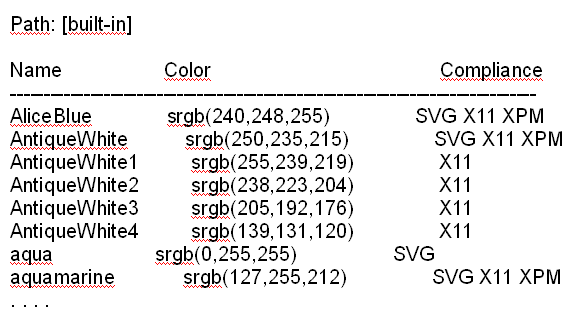 | convert -list color | sed '1,5d'| while read color junk; do convert -label $color -size 120x20 xc:$color +depth miff:-; done | montage - -frame 5 -tile 6x -geometry +2+2 -background black Farbtabelle.png |