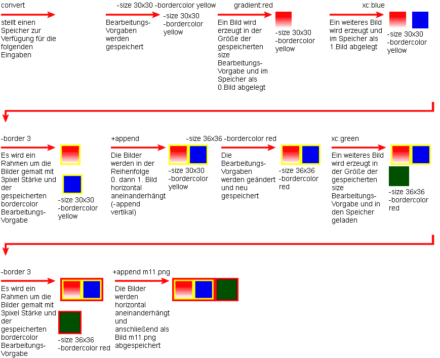 und weiß. Sofern eine einzelne Farbe angegeben wird sucht das Programm schwarz oder weiß als zweite Farbe aus um den Verlauf zu erzeugen. Aber man kann gleich zwei verschiedene Farben angeben. Dazu muß man alles in ' setzen. Auch transparente/halbtransparente Bilder sind möglich. Die Terminal-Eingaben von ImageMagick haben eine eigene Reihenfolge. Es gibt Bearbeitungs-Vorgaben (Setting Options): Diese müssen zuerst eingegeben werden. Sie sind für die spätere Verwendung durch Bild-Operationen vorgesehen. Folgen keine Bild-Operationen so haben diese gespeicherten Vorgaben keine Auswirkung. Die Bild-Operationen kann man einteilen in Bild-Erzeugungs-Operationen: xc: canvas: gradient: radial-gradient: plasma: und andere. Diese laden Bilder in den Speicher unter Berücksichtigung von gesetzten Bearbeitungs-Vorgaben. Bereits im Speicher vorhandene Bilder werden dabei nicht verändert. Zu den Bild-Erzeugungs-Operationen gehören in diesem Sinne auch Bilder die durch convert eingelesen werden, also BILD.FORMAT (A.png B.jpg C.tiff D.gif usw.) Bild-Veränderungs-Operationen z.B.: -crop -repage -border -rotate -flip -flop -draw und andere. Diese Operationen werden sofort angewendet wenn sie im Terminal auftauchen und zwar auf alle im Speicher befindlichen Bilder, der Reihe nach wie diese eingelesen wurden. Es gibt also eine Liste mit durchnumerierten eingelesenen Bildern, beginnend mit 0. Dabei kann eine solche Bild-Veränderungsoperation (z.B. -crop) weitere Bilder im Speicher erzeugen und der Bilder-Liste hinzufügen. Auf alle später eingelesenen Bilder haben Bild-Veränderungsoperationen keine Auswirkung. Bilder-Liste-Operationen Diese Operationen können die gesamte Bilder-Liste in ein einziges Bild umschreiben. Oder auch die Bilder in der Bilder-Liste verändern in Abhängigkeit von vorhergehenden oder nachfolgenden Bildern aus der Bilder-Liste z.B. -append -flatten -mosaic -layers -composite und andere. Bilder-Stack-Operationen Diese Operationen verändern die Bilder selbst nicht sondern ändern die Reihenfolge in der Bilder-Liste -delete -insert -swap -reverse -duplicate -clone \( \) und andere. Und es gibt noch einige besondere Operationen. Das letzte angegebene BILD.FORMAT bestimmt wie die im Speicher