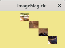 | convert deb6511.jpg -crop 30x25 -write mpr:Q -delete 0--1 \( mpr:Q[26] mpr:Q[18] mpr:Q[10] mpr:Q[2] -background none -flatten \) +depth miff:- | montage - -tile 1x -geometry +6+6 -background khaki x: |