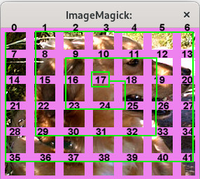| convert deb6511.jpg -crop 30x25 +depth miff:- | montage - -tile 7x -geometry +6+6 -background violet x: |