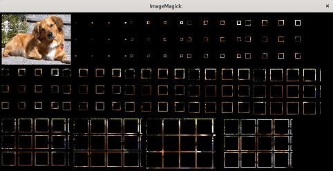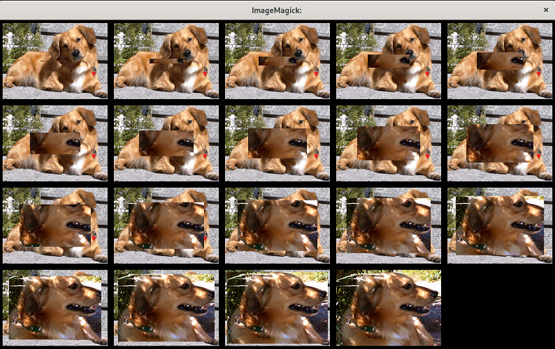 | for i in {0..18}; do let d=56+i*8; let e=1+i*8; let f=72-i*4; let i=i+1; convert deb6510.jpg \( deb6511.jpg -crop $d\x$e+$f+$f \) -geometry +$f+$f -composite +depth miff:- ; done | montage - -tile 5x -geometry +6+6 -background black x: |