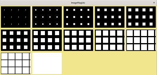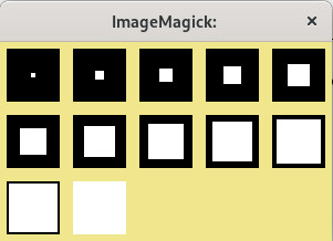 | for i in {1..12}; do let d=i*4; let e=24-i*2; let i=i+1; convert -size 48x48 xc:black -size $d\x$d xc:white -geometry +$e+$e -composite +depth miff:- ; done | montage - -tile 5x -geometry +6+6 -background khaki x: |