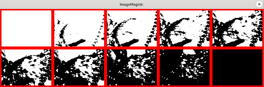 | for i in 0 5 10 15 20 25 30 40 55 100 ; do convert deb66A1.jpg -threshold $i% +depth miff:-; done | montage - -tile 5x -geometry +6+6 -background red x: |