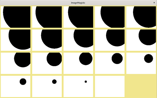 | for m in {1..19} ; do let m=m+1; let n=100-5*m; convert -size 300x300 radial-gradient: -negate -crop 200x145+0+110 +repage -threshold $n% +depth miff:- ; done | montage - -tile 5x -geometry +6+6 -background khaki x: |