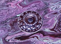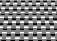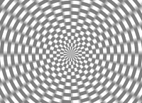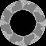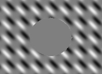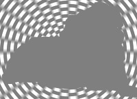 Die Wirkung der Option mirror bei dem Befehl -virtual-pixel ist hier gut zu sehen im unteren Bereich da dort Plättchen vom nach unten gespiegelten Hund Rene hochgeschoben werden. Es scheinen sich die Plättchen von unten nach oben zu bewegen. Aber beim genaueren Hinschauen zeigt sich daß sich die Plättchen ständig verändern. Eigentlich passiert folgendes: Alles was die Farbe gray50 besitzt bildet eine Trägerfolie die an vielen Stellen durchlöchert ist. Durch diese Löcher sieht man das darunterliegende Bild und dieses wird bewegt. Man kann mit -distort Arc eine kreisförmige Verzerrung erreichen, z.B. |