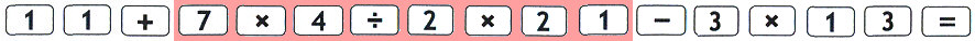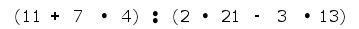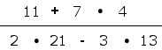 gleich 7x4+11, bei der Verwendung eines kaufmännischen Taschenrechners. Der Grund ist daß der kaufmännische Taschenrechner nach anderen Regeln programmiert wurde. Es wird nach jeder Rechenoperation gleich eine Zwischensumme gebildet und es gilt nicht die Regel Punkt-vor-Strich, d.h. die Multiplikation bindet NICHT stärker als die Addition. Bei einem kaufmännischen Taschenrechner rechnet man am besten Multiplikation und Division im normalen Zählwerk und tippt mit M+ und M- die Addition/Subtraktion in den Speicher. Wichtig ist also immer die Regeln zu kennen. Bei einem wissenschaftlichen Taschenrechner wird Punkt-vor-Strich berücksichtigt und die obigen Taschenrechner-Eingaben führen zum gleichen Ergebnis. Wie sieht es beim wissenschaftlichen Taschenrechner mit folgender Aufgabe aus. Eintippen der Zahlen/Operationen nach der üblichen Lese-Regel: von links nach rechts lesen und von oben nach unten: |