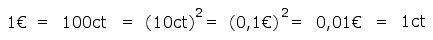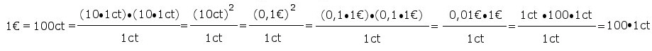 | Die Regeln ganz ausführlich 1)=: 1€=100 x 1ct =10 x 10 x 1ct 2)=: ab/b=a mit a=10 x 1ct x 10 und b=1ct ,Regel für das Kürzen/Erweitern und ab=ba, Reihenfolge der Multiplikation ist gleichgültig 3)=: aa=a2 mit a=10 x 1ct =10ct 4)=: 10ct=0,1 x 100 x 1ct =0,1€ 5)=: a2=aa mit a=0,1 x 1€ =0,1€ 6)=: ab=ba, Reihenfolge der Multiplikation ist gleichgültig 7)=: 1€=100 x 1ct 8)=: ab/b=a mit a =0,01€ x 100 und b=1ct ,Regel für das Kürzen/Erweitern und ab=ba, Reihenfolge der Multiplikation ist gleichgültig Vielleicht noch ein Wort zur Situation in der realen Welt |
