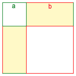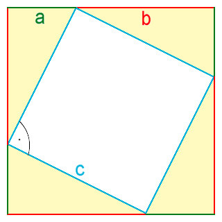 rechte Winkel besitzt. Setzt man B=(a+b)² - 2ab so zeigt die linke Figur c²=B Nach der obigen binomischen Formel gilt B=a²+b² Damit hat man ![]() Der Satz des Pythagoras. Hierbei wurden nur Flächenvergleiche durchgeführt und der Klammerausdruck nicht wirklich ausmultipliziert. |