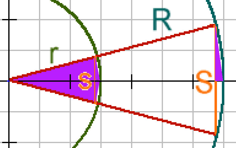 12-fache davon erhält man eine grobe Näherung des Kreisumfanges ![]() Mit einem Taschenrechner läßt sich das schnell ausrechnen. Erhöht man die Anzahl der aneinanderliegenden Kreisausschnitte, z.B. 1200 so erhält man ![]() Mit weiterer Erhöhung der Anzahl der aneinanderliegenden Kreisausschnitte werden die Ergebnisse immer genauer, d.h. die Anzahl der Stellen hinter dem Komma die sich nicht verändern wird immer größer. Damit kann man das Ergebnis beliebig genau berechnen. Betrachtet man jetzt beide Kreise so ergibt ein Strahlensatz s/r =S/R und damit auch U(r,1200)/r = U(R,1200)/R Denkt man sich die Anzahl beliebig groß so erhält man die Aussage, daß das Verhältnis von Umfang/Radius für jeden Kreis gleich groß ist. Historisch wurde der Durchmesser des Kreises benutzt um dieser Konstanten einen Namen zu geben Kreisumfang=Kreisdurchmesser x Und oben wurde Solche Überlegungen kann man auch durchführen um den Flächeninhalt des Kreises zu bestimmen. Dazu kann man die waagrechte Grundseite auf r vergrößern um das lila Dreieck über der schwarzen Linie zu erhalten. Und für dieses ist der Flächeninhalt dann Grundseite=r multipliziert mit der Höhe=s/2 multipliziert mit 1/2. |