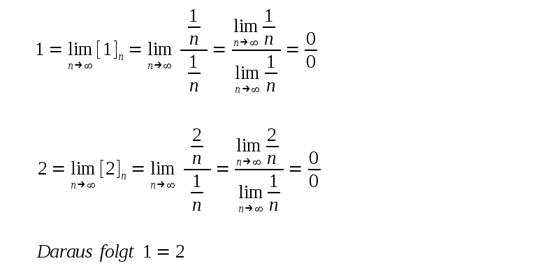 | Hier ist natürlich ein Fehler gemacht worden. Sicherlich darf man nicht durch 0 teilen. Aber der wesentliche Fehler ist daß die Regeln für die lim-Bildung nicht beachtet wurden. Hier einige Regeln: |