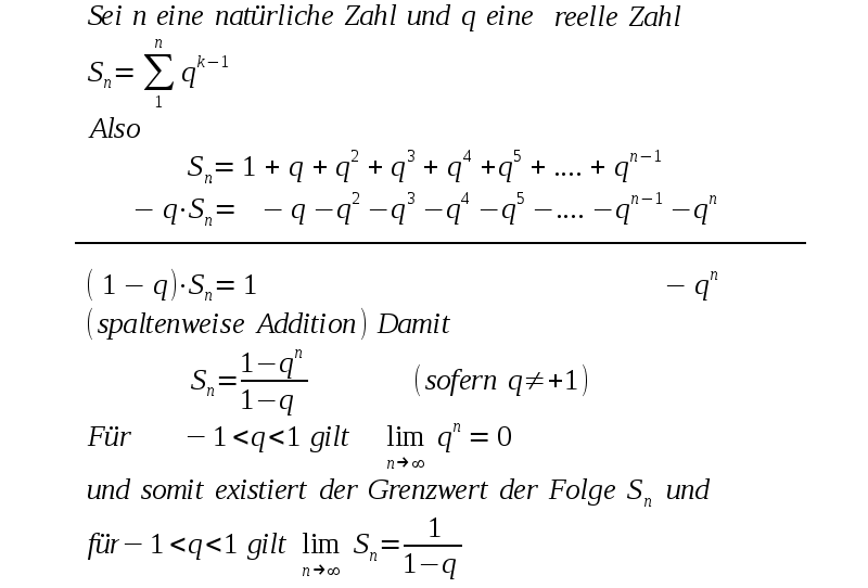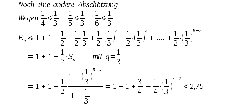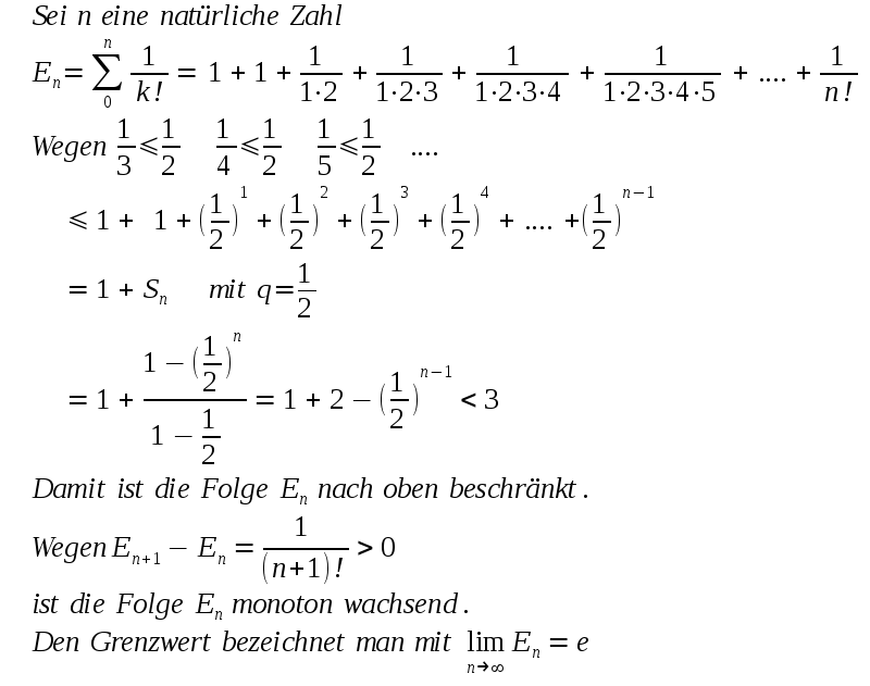 die sich "neue" Zahlen definieren, z.B. die Zahl e. Zum Nachweis daß folgender Grenzwert existiert wird eine Regel benutzt, die analog der weiter oben verwendeten Regel funktioniert (wachsende Folge mit oberer Grenze): Gibt es eine reelle Zahl so daß alle (evtl. bis auf endlich viele Ausnahmen) Folgen-Elemente KLEINER (oder gleich) sind als diese Zahl und gilt An+1 ≥ An für alle (evtl. bis auf endlich viele Ausnahmen) Folgen-Elemente, so existiert für diese Folge ein Grenzwert. |