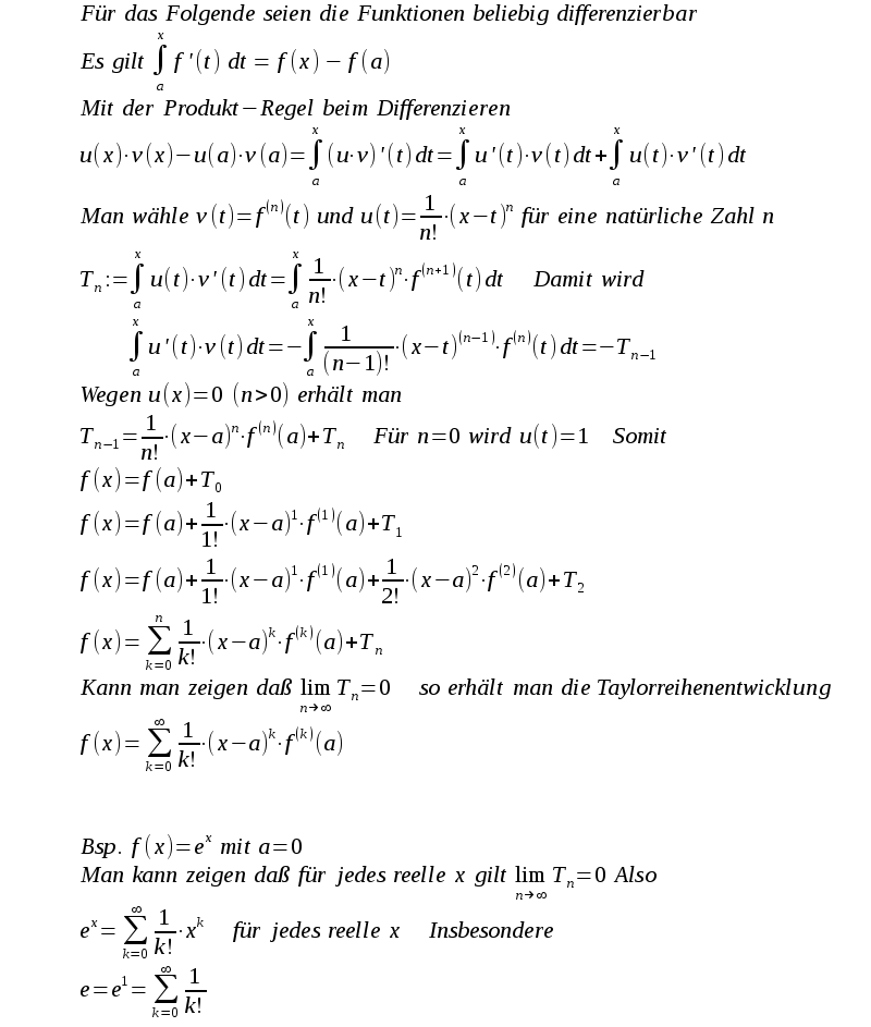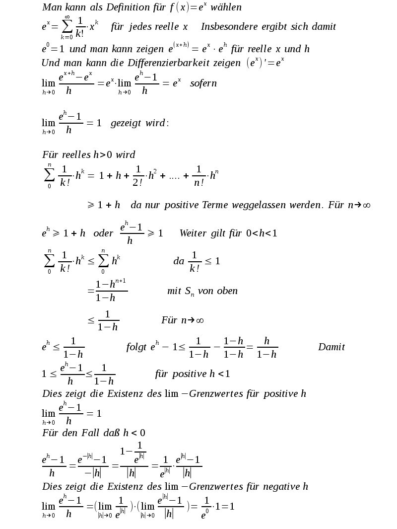 | Und dies genügt schon um ein Bild der Kurve von f(x)=ex zu zeichnen. Mit der programmierbaren Vorschrift Mn kann man 1/3-tel Werte berechnen und mit weiteren programmierbaren Vorschriften kann man beliebige Wurzeln berechnen und also im Prinzip die f(x)=ex für jede rationale Zahl berechnen, also beliebig genau annähern. Trotzdem wäre es wünschenswert wenn es nur eine programmierbare Vorschrift zum Berechnen geben würde. Und daher startet man die Funktion f(x)=ex mit einer Definition (die auch für komplexe Zahlen funktioniert): |