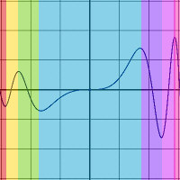 negativ-wertige Wurzel-Funktion. Man kann sagen daß die Umkehr-Normalparabel-Kurve (die Wurzel-Kurve) zu einem vorgegebenen positiven x zwei Lösungen für y besitzt. Heute sagt man: Die Normalparabel-Funktion läßt sich in zwei umkehrbare Funktionen zerlegen, die beide zu einem vorgegebenen positiven x jeweils eine Lösung für y besitzen. Man kann sagen daß die Umkehr-Sinus-Kurve zu einem vorgegebenen x (-1<x<+1) unendlich viele Lösungen für y besitzt. Heute sagt man: Die Sinus-Funktion läßt sich in unendlich viele umkehrbare Funktionen zerlegen, von denen unendlich viele zu einem vorgegebenen x (-1<x<+1) jeweils eine Lösung für y besitzen. Wählt man für die umkehrbaren Funktionen ein x-Intervall z.B. mit der Länge Generell also: Die Beziehung zwischen x und y als Kurve verdeutlichen, dann in Scheibchen-Funktionen zerlegen (z.B. den Kreis in positive Kreishälfte und negative Kreishälfte) und die Scheibchen-Funktionen in weitere Scheibchen-Funktionen zerlegen, die umkehrbar sind (z.B. rechtes positives Kreisviertel, linkes positives Kreisviertel,...). Für die obige Funktion ist hier die Scheibchen-Zerlegung farbig dargestellt: |