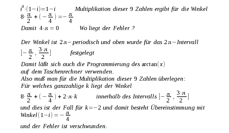 für den Winkel einer komplexen Zahl das 2 [0,2 zugrundegelegt und mit geometrischen Überlegungen der Winkel bestimmt. Dann muß man zur Bestimmung des Schulwinkel(1-i) überlegen: Für welches ganzzahlige k liegt - Dies ist der Fall für k=1. Also Schulwinkel(1-i)=- Und noch eine falsche Argumentation: |
