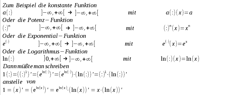 | Anschaulich ist es einleuchtend daß es solche Funktionen gibt. Aber in der Mathematik braucht man konkrete Beispiele: |