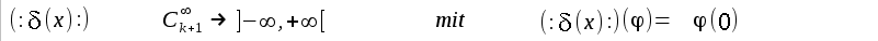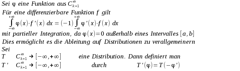 | Gibt man einen x-Wert A Das ist unerheblich denn die Distribution hat als Definitionsbereich Für Distributionen läßt sich die Ableitung einfach über die Ableitung der Testfunktionen erklären: |