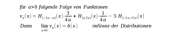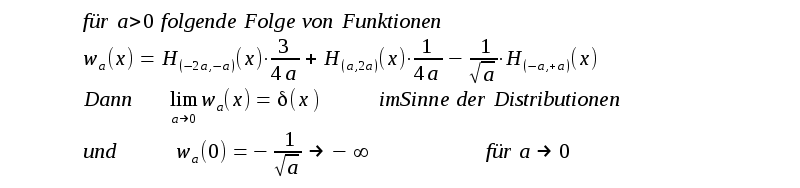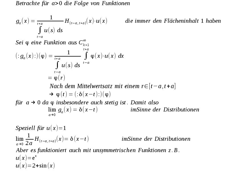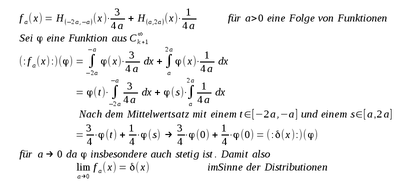 Dirac-Delta-Funktion eine gerade Funktion sein soll. Auch ist jedes Folgen-Element in einem ganzen Intervall (-a,+a) identisch 0 . Daher ist es schwierig sich vorzustellen daß die Dirac-Delta-Funktion (die außerhalb Nullpunkt generell 0 ist) im Nullpunkt so stark gegen unendlich geht daß der Flächeninhalt bei 1 bleibt. Solche Vorstellungen sind nur bedingt hilfreich. Der Definitionsbereich der Dirac-Delta-Distribution besteht eben nicht aus x-Werten sondern aus Testfunktionen. Leichte Änderung |