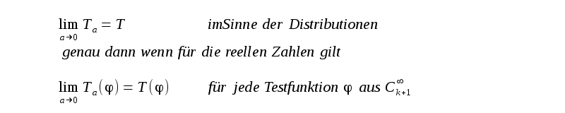 | Also H(0,2)(x) sin(1/x) H(-2,0)(x) 1/x² + H(0,1)(x) 1/x² Berechnet man bei diesen Beispielen aber die Integrale über Funktion x Testfunktion so steht man vor der Problematik von divergenten Integralen. Diese Integrale werden dann durch Cauchy-Hauptwert oder Hadamard-Hauptwert so modifiziert daß sich die unendlich hohe Sprunghöhe herausrechnet. Nun wurde der Begriff der Funktion anders gefaßt. Es stellt sich die Frage nach dem Abstand jetzt für Distributionen. Was bedeuted es zu sagen daß zwei Distributionen nahe sind. Was bedeuted es zu sagen daß sich eine Folge von Distributionen an eine andere Distribution annähert. Da die Distributionswerte reelle Zahlen sind kann man einfach auf den Abstand für reelle Zahlen zurückgreifen. Sei a>0 eine reelle Zahl und Ta eine Folge von Distributionen. Dann gilt für eine Distribution T |