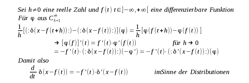 Nun kann man sich vorstellen daß die Dirac-Delta-Funktion sich räumlich verändert wenn man ein Zeitintervall betrachtet. Dann gibt es einen Zeitparameter t und eine zeitabhängige Dirac-Delta-Funktion Ist die Funktion f stetig so ist auch die Raumverschiebung der zeitabhängigen Dirac-Delta-Funktion "stetig", denn für a -> 0 (: Die Testfunktionen geben die Eigenschaften der Funktion f an die Distribution weiter. Damit kann man auch die Ableitung nach dem Zeitparameter aufschreiben. |