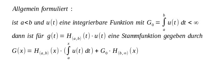 differenzierbar. Versteht man g als reguläre Distribution so ist auch G eine reguläre Distribution. Und mit der Ableitung für Distributionen ergibt sich G'(x)=H(a,b)(x).u(x)+0. im Sinne der Distributionen. Und mit dem obigen (formalen) Integralbegriff kann man auch Stammfunktionen für Distributionen berechnen - vielleicht besser als Stammdistributionen bezeichnet. Dazu wird die Ableitung der obigen Beispiel-Sprungfunktion benutzt |