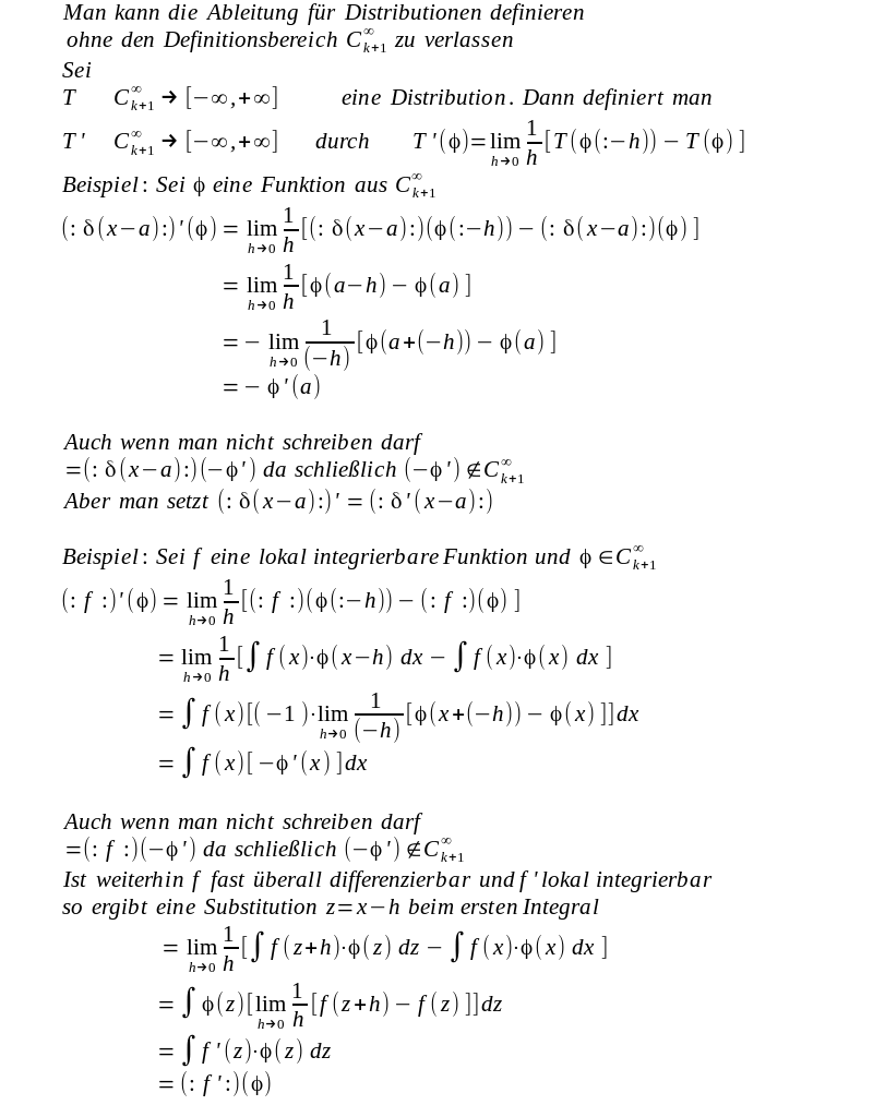 Verhalten der abstrakten Funktion ist. Aber die Die Die Mathematiker wollen ein formal einwandfreies Gedankengebäude und nehmen einen Testfunktionenraum ohne die Einschränkung von nichtnegativ und ohne Flächeninhalt=1 . Dann kann man die Ableitung einer Distribution T gut definieren über |