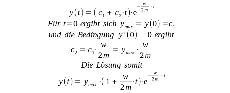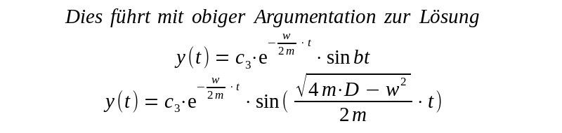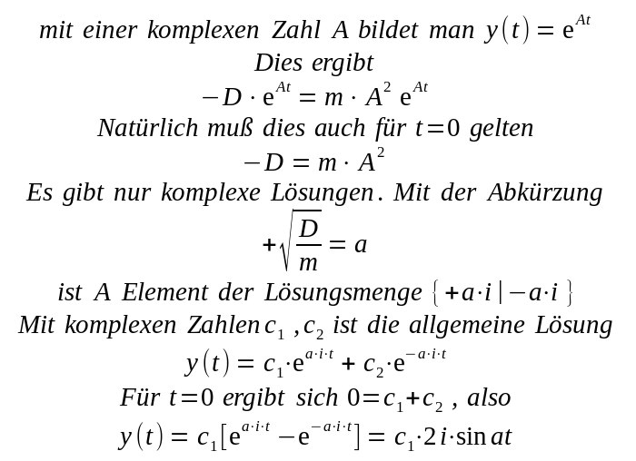 | Wählt man den zeitlichen Nullpunkt so daß die Auslenkung Null ist, y(0)=0 so folgt wieder c2=-c1 und mit einer neuen Konstanten c3=c1.2i ergibt sich die Lösung |