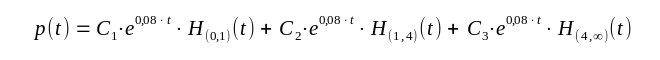 | Auf den Intervallen (0,1) und (1,4) und (4,∞) gilt die Gleichung p'(t) - 0,08 p(t) = 0 im Sinne der Funktionen. Diese Gleichung wird von einer e-Funktion erfüllt. Die Lösungsfunktion also |